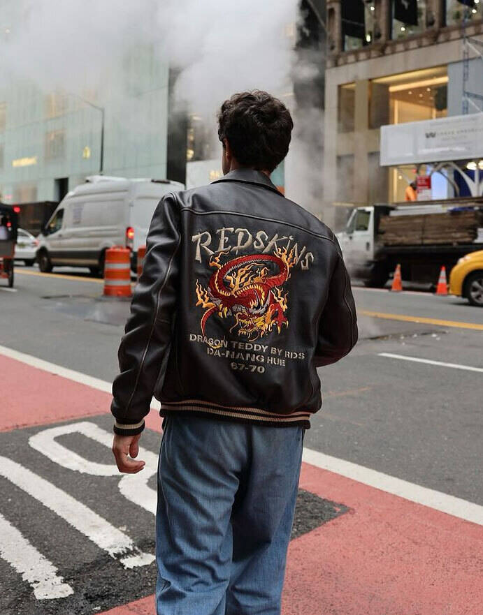 Leather jacket in aged cowhide for men from the Redskins brand. There is a Teddy style with its rounded shape, its sleeve knits and the size and a double shirt + knitting collar. The leather jacket closes with pressures and you have 2 pockets at the waist. It is accessorized with 3 embroidery 2 on the chest and a magnificent dragon in the back. Inside, you have a 100% polyester lining with 2 pockets. For body length, it takes 65 cms for a size XL.