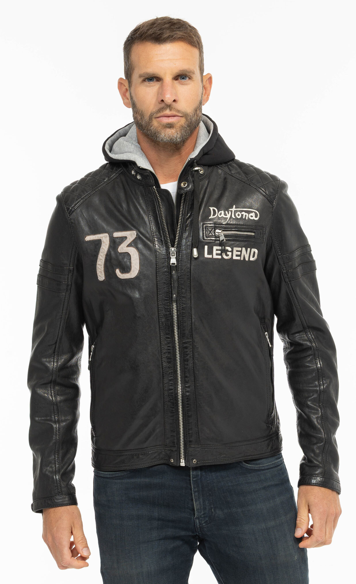 Men's lambskin leather jacket with removable hood from the Daytona brand. We find a slightly fitted cut and an easily recognizable biker style with its mandarin collar with snap, its quilted effect stitching at the shoulders, its bands at the arm level and its various patches. The leather jacket closes with a central zipper and has a cuff finish with pressure + closure on the back of the sleeve as well as a pocket at chest level. Inside, the lining is cotton for the body with 3 pockets and polyester for the sleeves.
