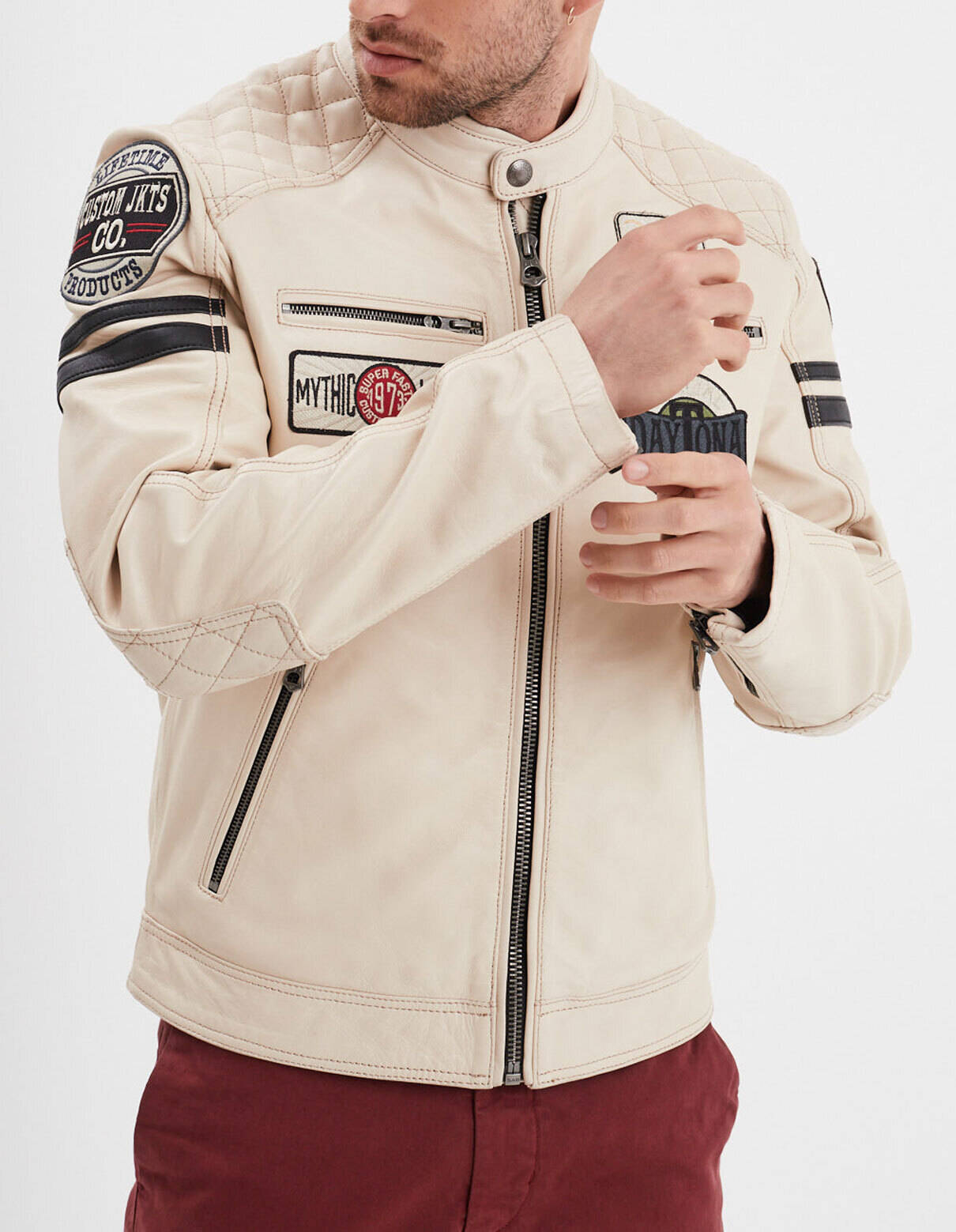 Men's leather jacket in lamb of the Daytona brand. This vintage motorcycle style leather jacket will seduce you thanks to its many artifices. He sports vintage motorcycle style badge. You also find Diamond stitching in the elbows and shoulders. Its retro side is accentuated with its leather strips on the arms in the past, aged. You have a small biker collar with pressure button, zipped sleeves. The leather jacket closes using a straight zip and has 4 outer zipped pockets including 2 in chest. The cut of this leather jacket is curved and its body length is 61 cms. Its lining is in cotton khaki green color with 3 interior pockets (zip, pressure and for the phone) and the lining of its sleeves is in polyester .