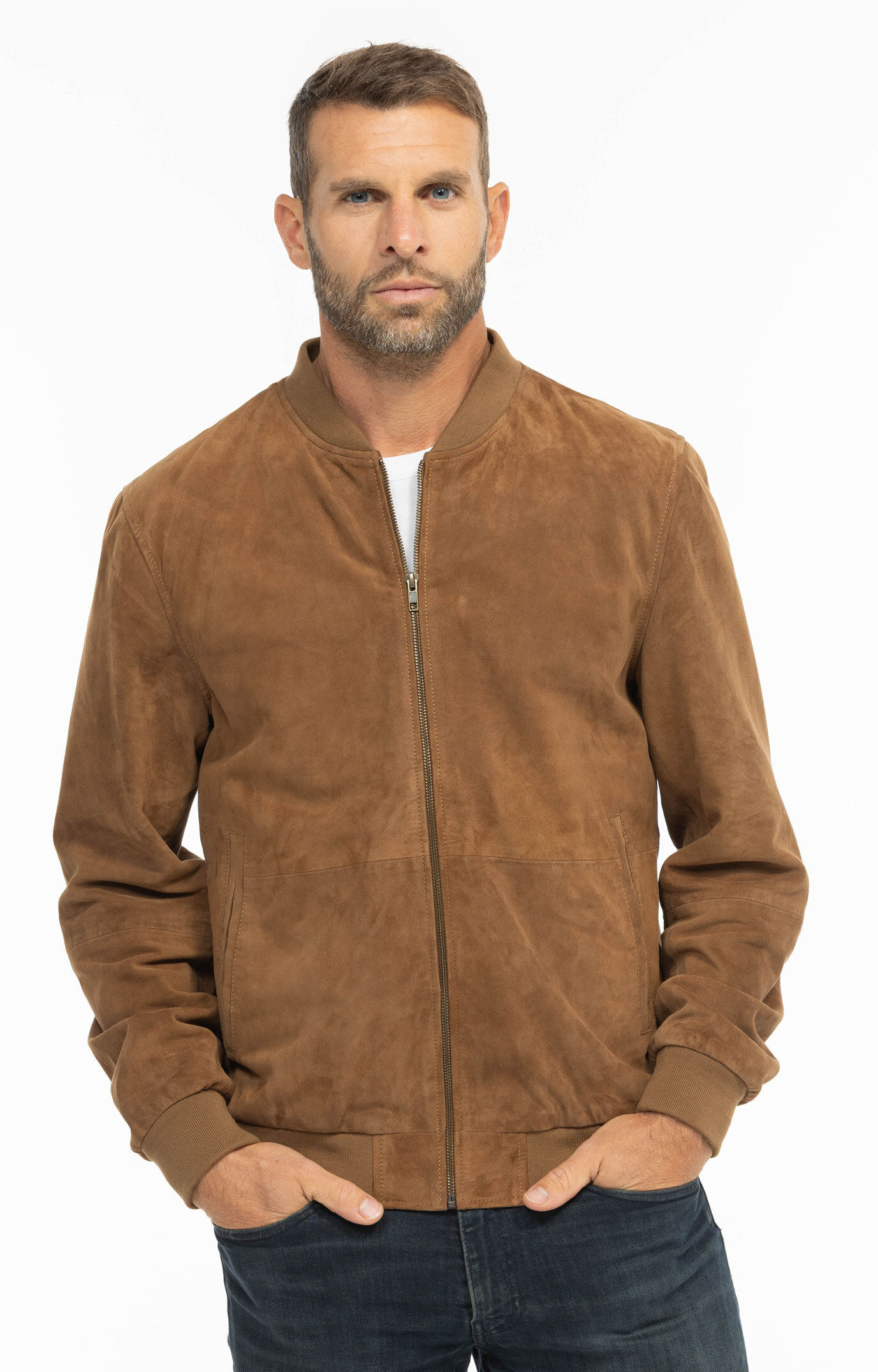 Suede and velvet goatskin leather jacket for men in a classic style, but still up to date, teddy spirit. We like its velvet skin, peach skin appearance, very nice for the summer, less strict. The leather jacket has a small stand-up collar, ribbed edges at the bottom of the sleeves and at the waist. The jacket is therefore loose on the body and tight at the waist, it lends itself very well to the silhouette. It remains very simple, no fancy inserts or stitching, just a small zipped pocket on the chest, so you can wear it very easily on all occasions. You have two slanted pockets and also pockets on the lining, practical for your personal belongings. The lining is comfortable in cotton on the body and polyester on the sleeves with 2 pockets with closures. Allow a body length of 67 cm on a size 48 from the base of the collar to the bottom of the jacket.