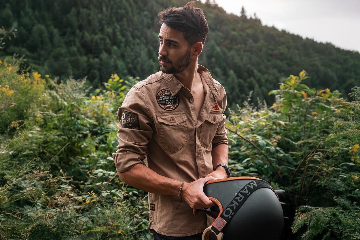 We love this men's shirt from the Daytona 73 collection. It is made of 100% cotton twill of 270 g/m², Garment dye (solution-dyed). In a regular cut, it has a shirt collar, buttonhole closure, 2 patch pockets with button flap. Show off a modern military look with this overshirt adorned with embroidered patches on the chest and arms. A perfect blend of robustness, style and unique details that bring a touch of originality to your wardrobe.