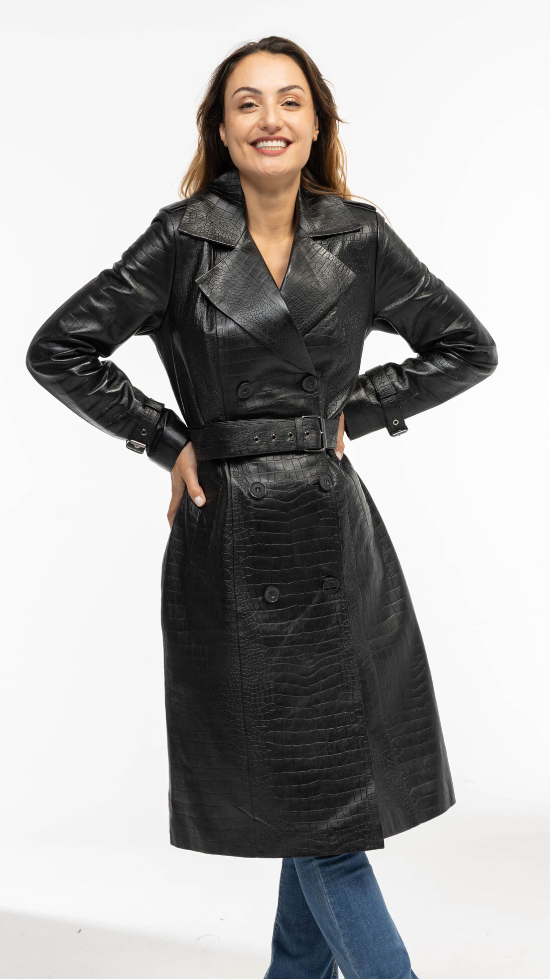 Three-quarter length in printed black lambskin (crocodile look) for women. We find a fitted cut and a classic, trendy and timeless style. The three-quarter leather is ideal for a dressy or more casual outfit, such as with jeans. It has a tailored collar, fancy tabs at the shoulders and cuffs and slit at the back. The three-quarter leather closes with a double buttoning (crossed) and a belt.