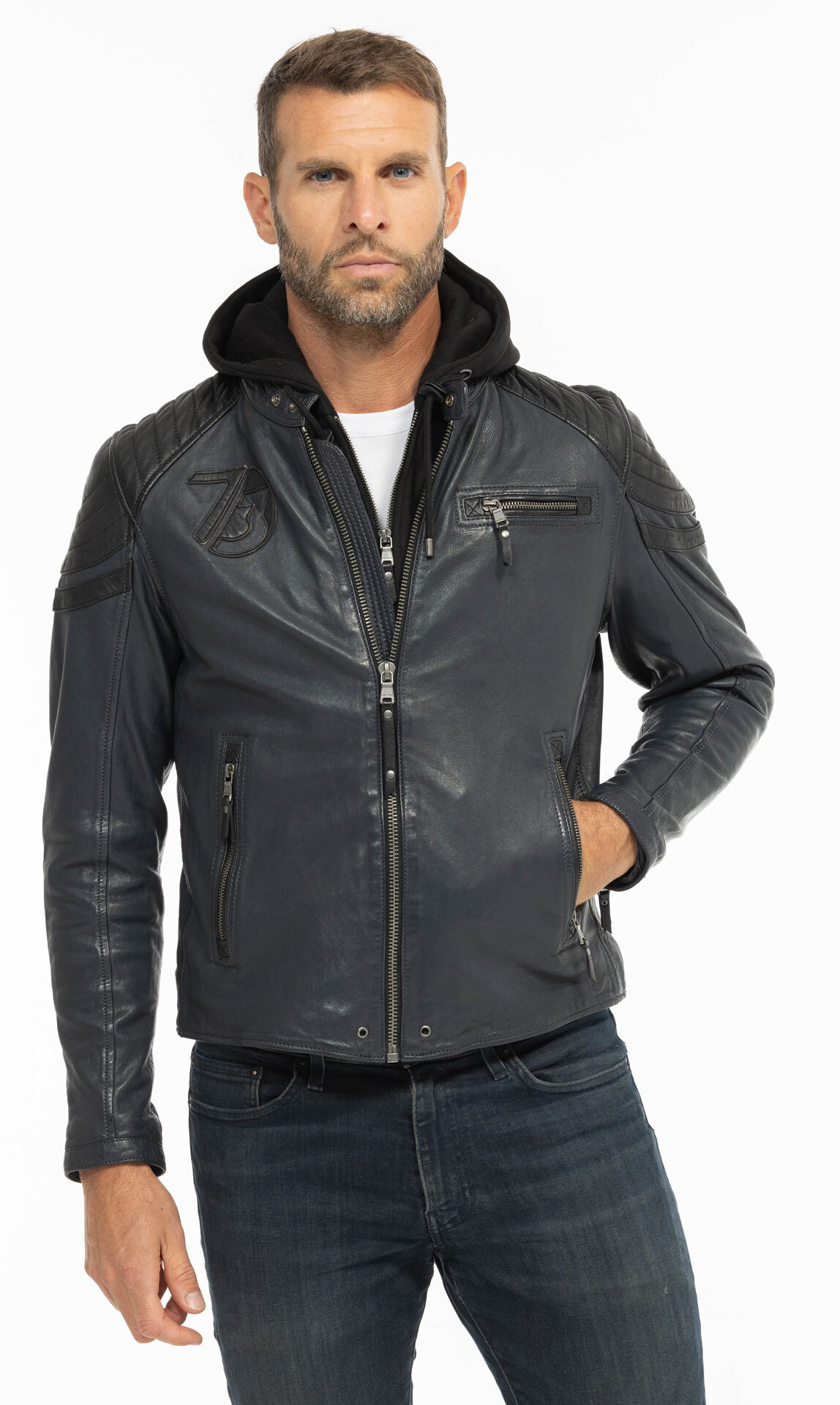 Men's jacket from the Daytona brand in lambskin, it has a removable hood. We find a slightly fitted cut, soft leather in a trendy sportswear look. Its removable hood offers us the possibility of two looks, a sporty side with it and a biker style without. Indeed, it is easily recognizable with its mandarin collar with snap, its quilted effect stitching on the shoulders and its various patches on the chest. The leather jacket closes with a central zipper, has a zipped finish on the back of the sleeve and a small zipped pocket on the chest. On the front, you also have two zipped slant pockets, inside, the lining is in cotton for the body with 3 pockets and in polyester for the sleeves.