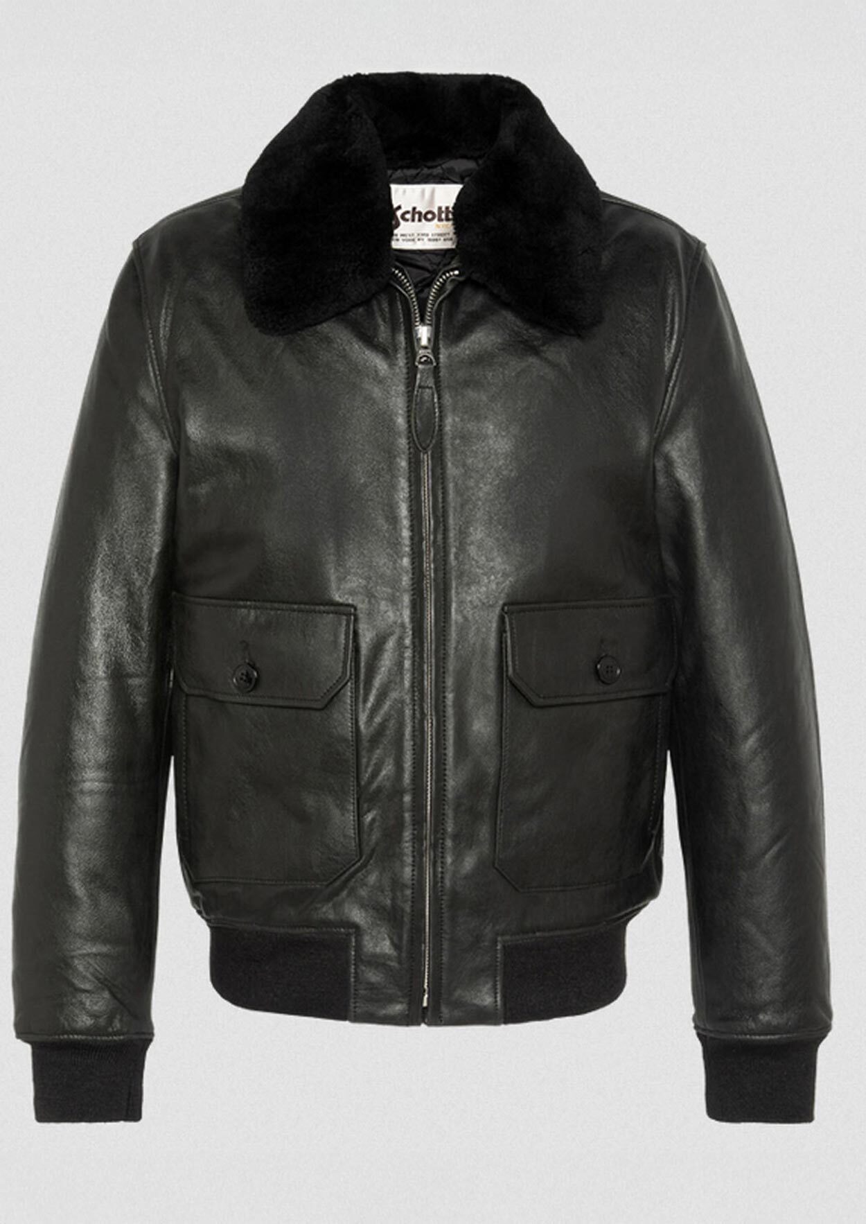 Vintage distressed goatskin leather bomber jacket for men from the Schott collection. It remains quite sober, simple and effective, the leather remains quite supple and soft, very comfortable in a standard cut. The leather jacket is made in an aviator cut with a shirt collar embellished with a removable collar in real sheepskin. You have a central zipped closure, 2 lower pockets with buttoned flaps and 2 side pockets, a ribbed finish on the cuffs and waist. The leather jacket is fully lined in nylon with polyester padding and has an interior snap pocket and one zipped pocket.