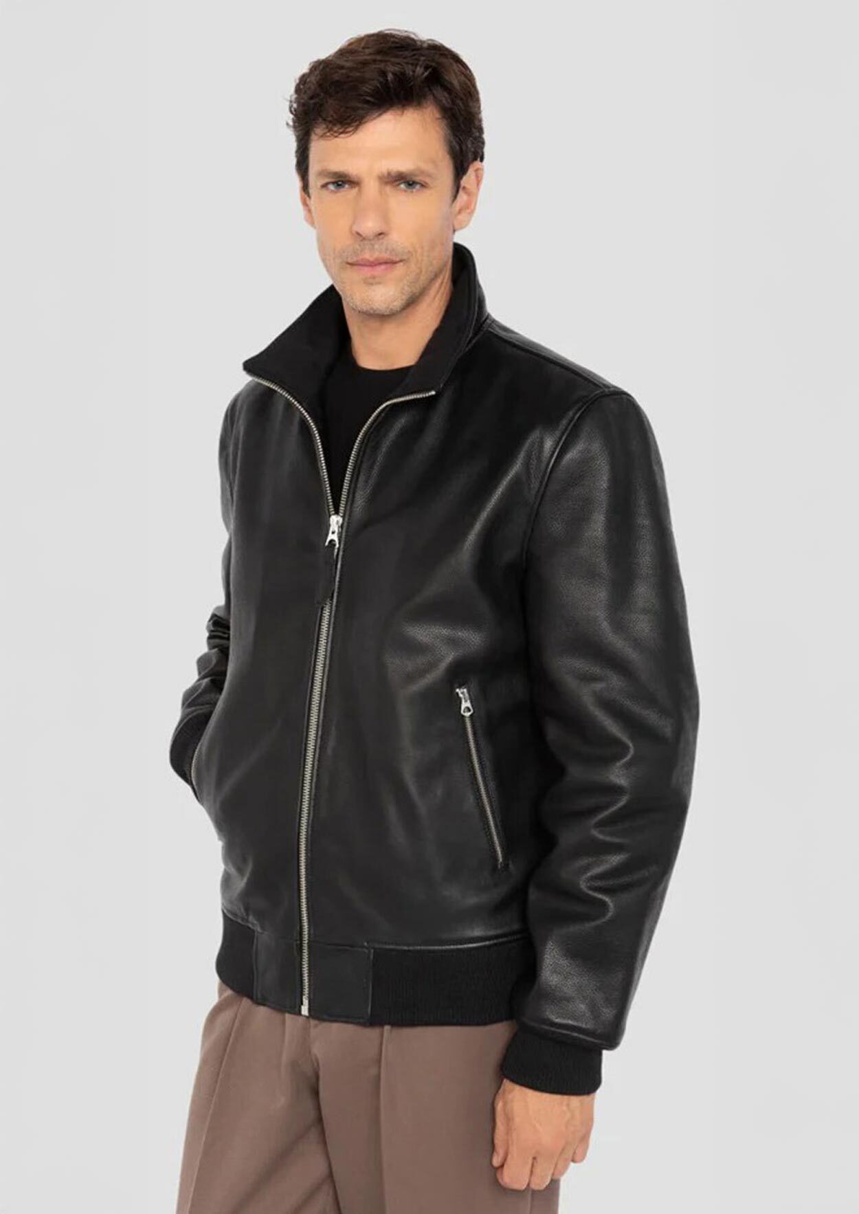 Retro leather jacket in black grained cowhide for men from the Schott brand. We find a slightly fitted cut in a trendy, contemporary and timeless style. Find a vintage and authentic spirit with this jacket which can be worn with jeans or dressier pants. The Schott leather jacket has a knitted shirt collar, 2 slanted zipped pockets at the waist and a ribbed finish on the cuffs and waistband. Inside, the leather jacket is fully lined in 100% nylon with polyester padding with 2 interior pockets.