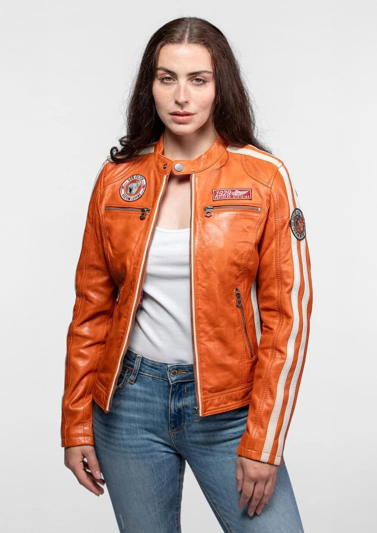 Very pretty women's jacket from the Rose Garden brand in a trendy biker look. It is made from 100% vegetable-tanned lamb leather. Assert your style with this Von Dutch leather jacket, inspired by the finest hours of vintage American racing. Between authenticity, character and modern cut, it embodies the rebellious and timeless DNA of the brand. To stand out and be more original, the leather jacket has vintage motorcycle-style embroidered patches on the arms and chest. In addition, there are also decorative side bands stitched to the arms. You have a mandarin collar with snap button, it closes with a straight zip, you have the back of the sleeves with zips. On the front, you have 4 exterior zipped pockets, two chest and two side. It is fully lined in cream-colored cotton for the body and the sleeves are in polyester.  This model is offered in a fitted cut to refine your silhouette.