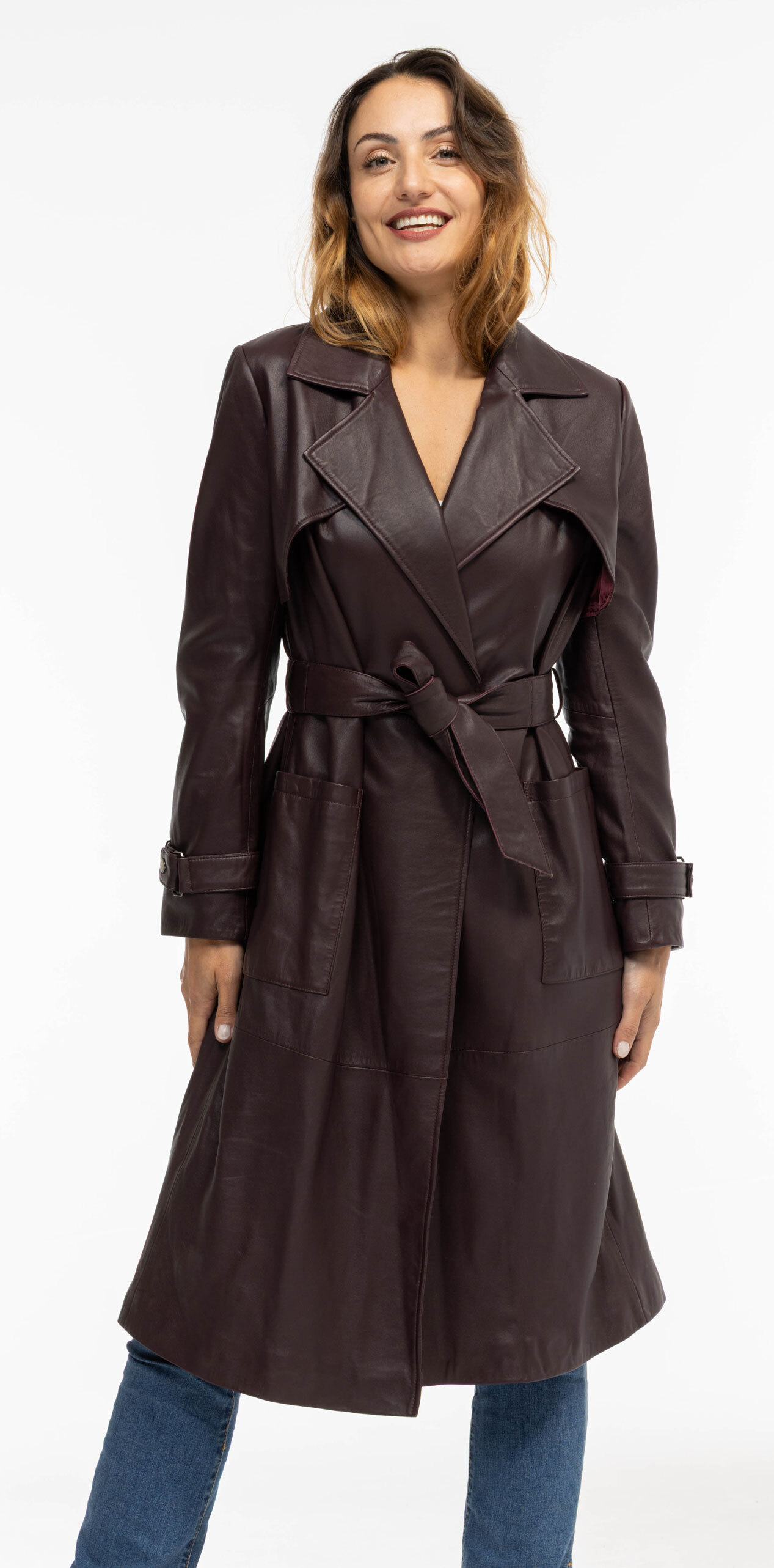 Burgundy lambskin coat for women from Cuirs Guignard. We find a slightly fitted cut and a classic, chic, trendy and timeless style with its tailored collar, its 2 straight patch pockets and its cape on the shoulders like in the spirit of the dust coats. The soft lambskin coat closes with a tie belt and finishes with tabs on the cuffs. Inside, the lining is polyester and you need a body length of 107 for a size L.