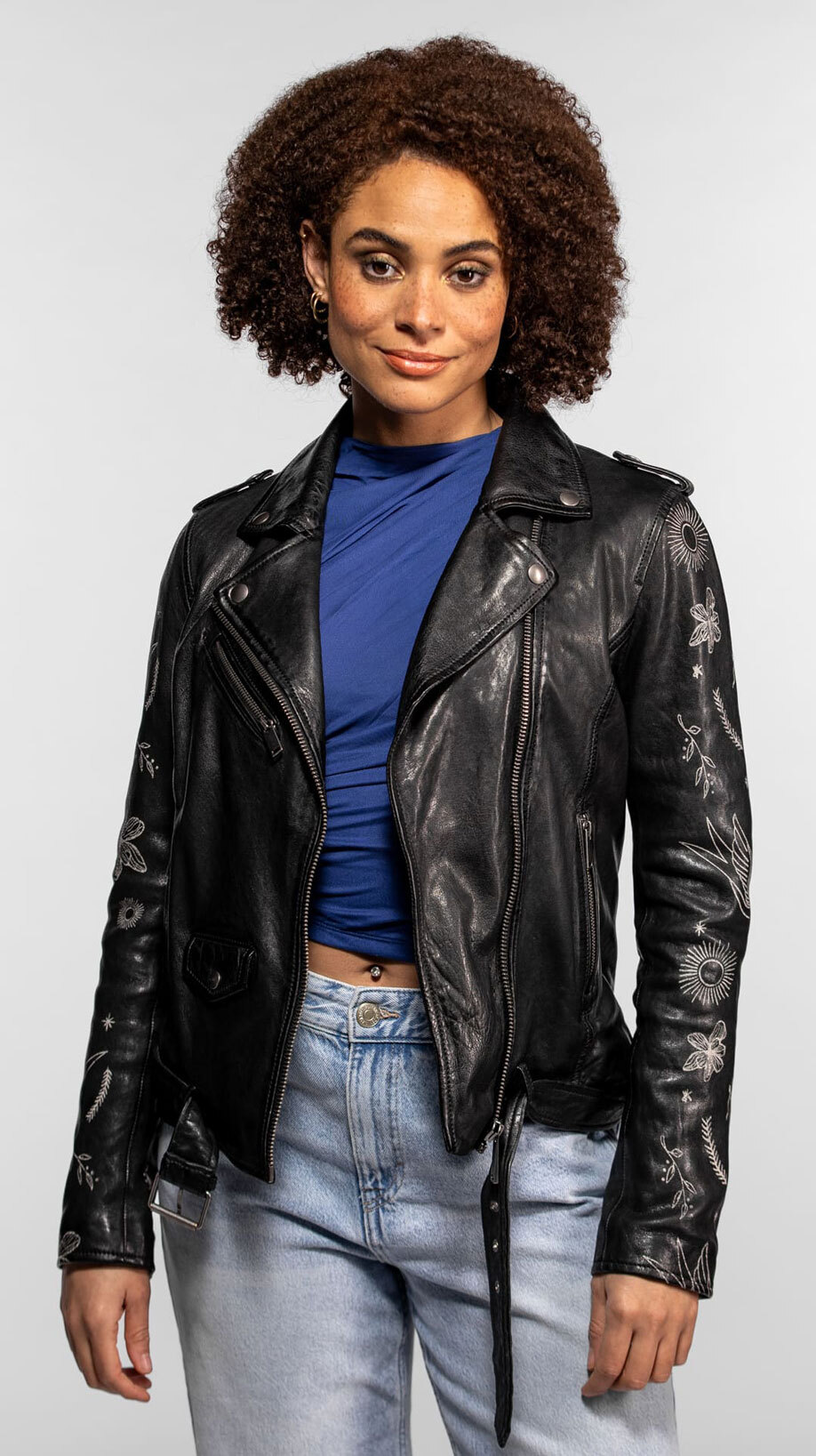 "The Nora model from Rose Garden is, for me, the piece you need to have in your wardrobe to never again ask yourself the question of "what to wear". What I prefer about this black women's biker style leather jacket is its press-stud collar which remains well in place and its patina which only becomes more beautiful: wear it open for a more casual look, a simple nourishing milk applied delicately will be enough to preserve the silky hand of this exceptional lamb.'