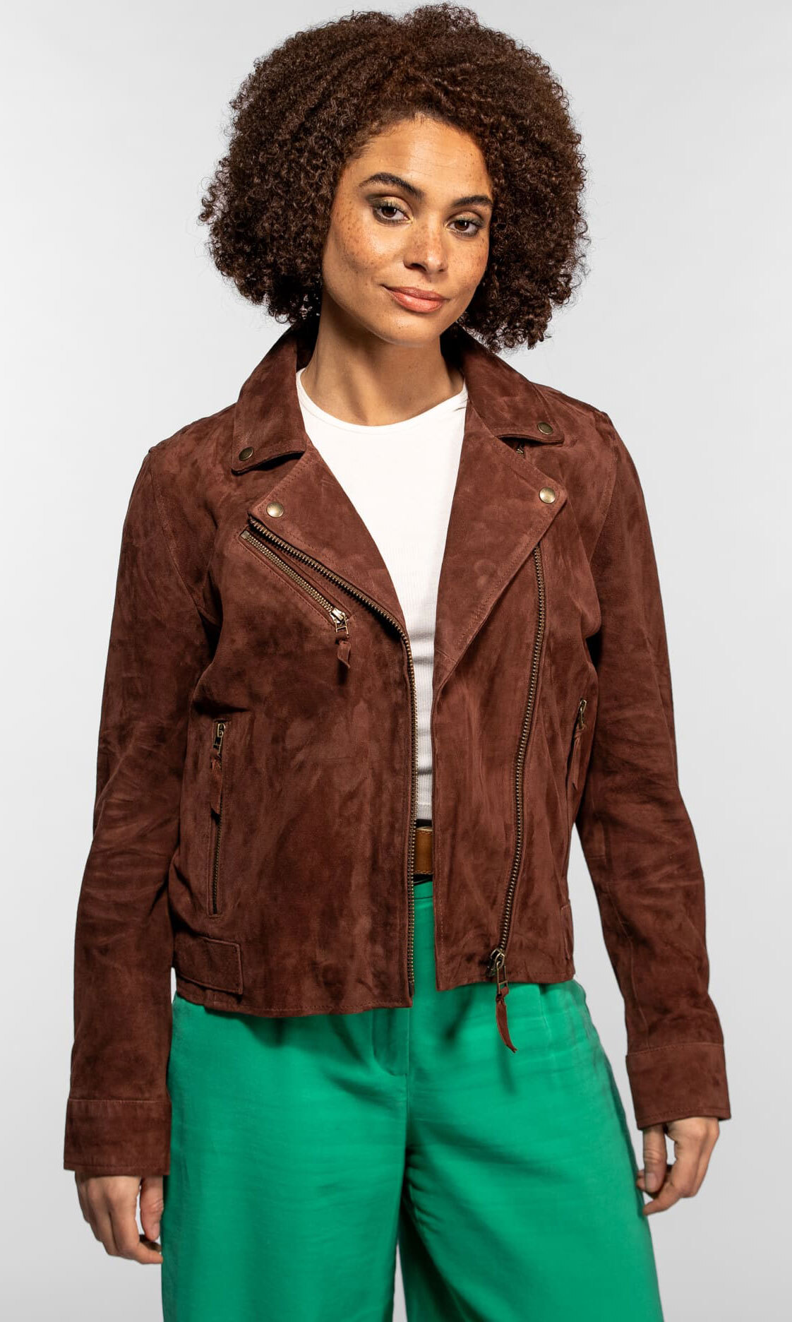 Rigid leather can sometimes lack the fluidity necessary for a spring or summer outfit. We often fear the too "biker" appearance while we are looking for lightness. The women's suede leather jacket "Fern" from the Rose Garden brand offers this perfect alternative: a velvet caress that enhances your silhouette with natural elegance.