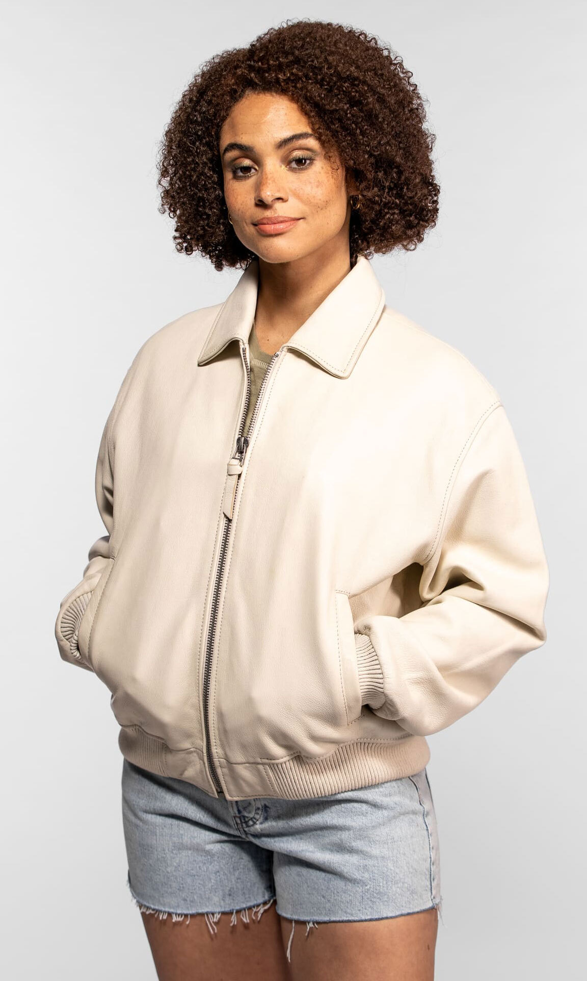 Rose Garden's "Tulip" model embodies the perfect balance between biker heritage and urban elegance. Its short, slightly rounded cut like the bombers, allows it to go with a chic or casual outfit. Our role as curator led us to this piece for the exceptional quality of its lambskin: a real “second skin” which gains character over time. Wearing this ivory women's leather jacket means ensuring an assertive look, capable of lasting through the seasons without ever betraying your identity.
