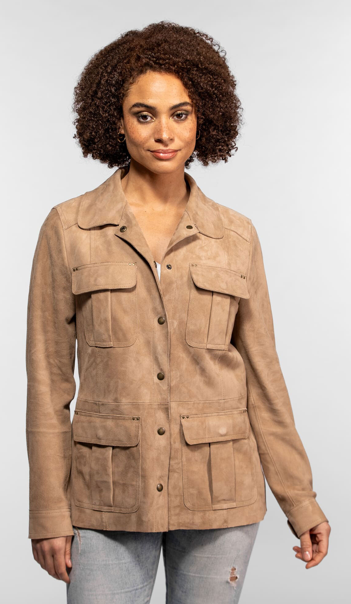 Wearing this piece means taking on natural, effortless elegance. Our role as curator led us to select this model for the exceptional quality of its velvet-like goatskin leather. This women's suede leather jacket from Rose Garden doesn't just follow the trends: it flies over them thanks to its luminous sand color and its perfectly structured cut. It quickly becomes this “second skin” that we enjoy putting on to gently structure a look.