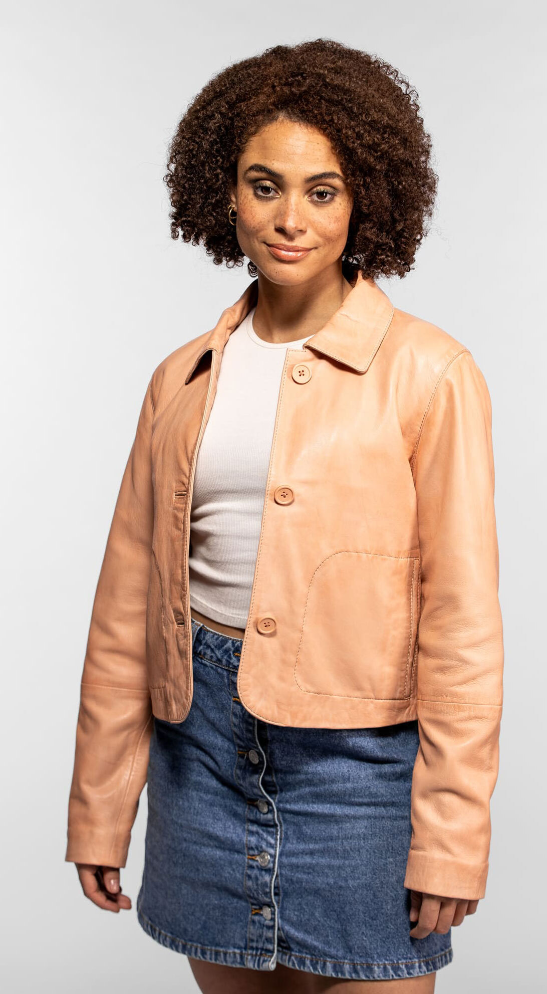 "What I like best about the "Wisteria" model from Rose Garden is its ability to transform any outfit. As an expert, I suggest you wear it over a light dress to break the rules, or with slim jeans for a total urban look. This jacketpeach women's leatheris a safe investment: its natural patina will make it even more beautiful in five years. To preserve it, avoid pouring rain and feed it very lightly once a year."