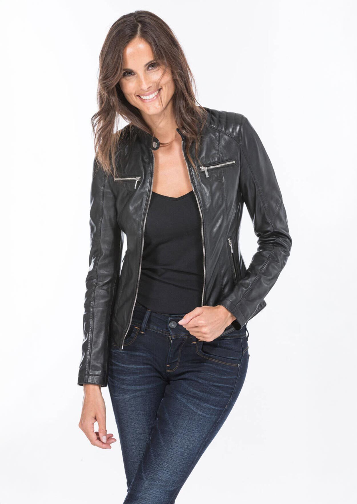 Lamb leather jacket, soft, light for women, trendy look. We find a fitted, feminine cut, with a look that is both sportswear and casual, with a motorcycle spirit. The leather jacket has a small mandarin collar with pressure, it closes with a central zip. On the front, there are two zipped chest pockets and two slanted zipped pockets. The jacket is fairly fitted to the body, it highlights the waist well and is quite narrow in the sleeve. Very easy to wear and combine, don't hesitate... Allow for a body length of 55 cm from the base of the collar to the bottom of the jacket.