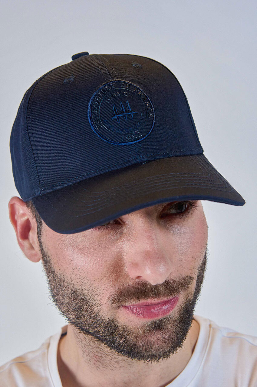 Men's cotton cap in navy color stamped and licensed by Patrouille de France. The cap is in a baseball cut with a visor and an adjustment system at the back.
